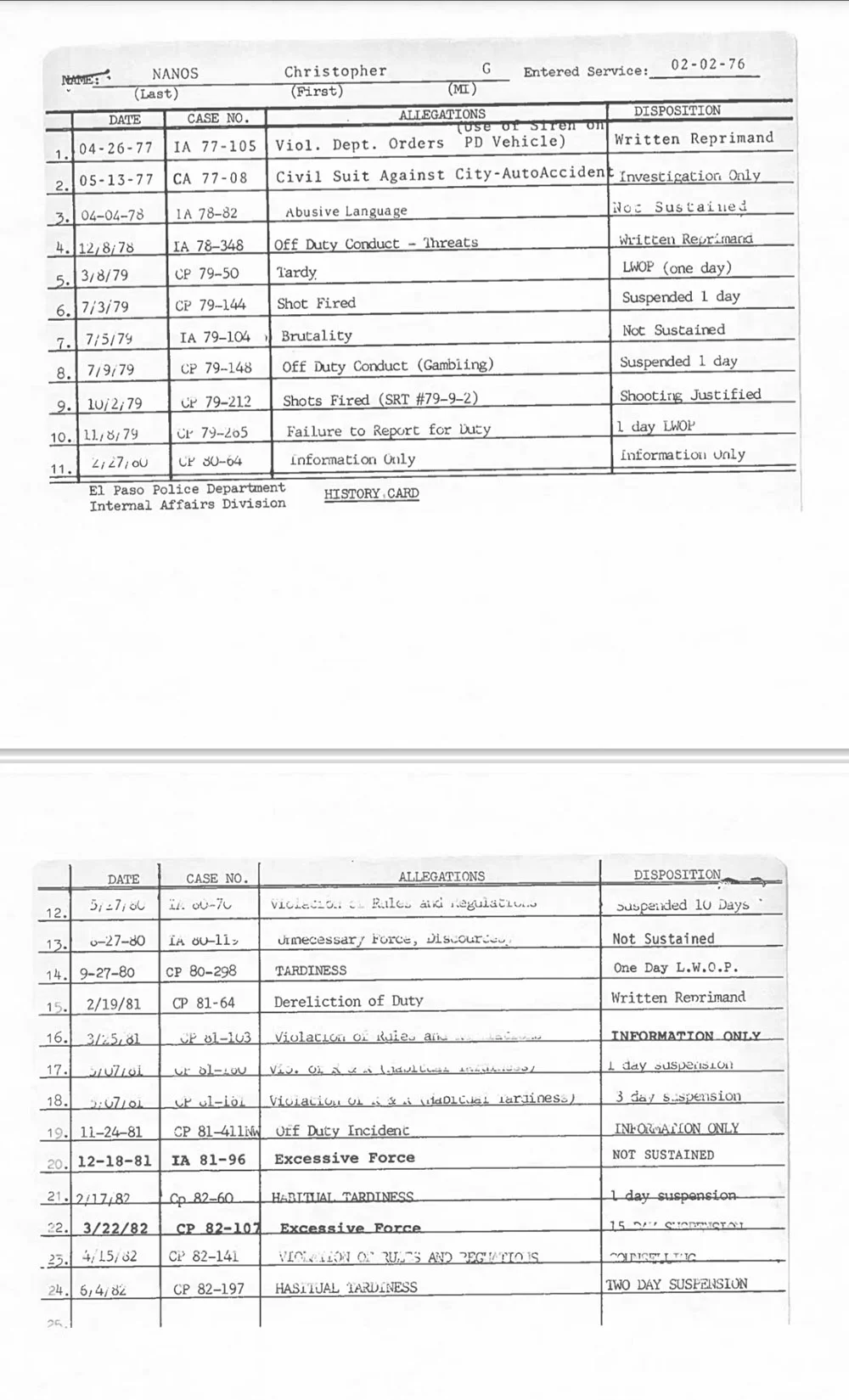 A more comprehensive review of El Paso PD internal affairs files, which have also been made public, reveals a troubling pattern of disciplinary actions against Nanos. Between July 1979 and June 1982, Nanos was suspended a total of eight times, accumulating 32 days of lost pay. These suspensions included a notable 15-day suspension in March 1982 for "excessive force." Dr. Heinz provided specific details regarding this incident, alleging that Nanos struck a handcuffed man in the head with a flashlight, an action that reportedly resulted in the man requiring intensive care unit (ICU) treatment.